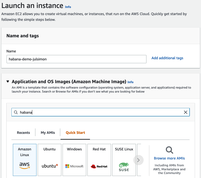 我首先登陆 us-east-1 区域的 EC2 控制台,然后单击 启动实例 并给实例起个名字 (我用的是 “habana-demo-julsimon”)。