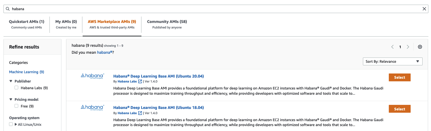 然后,我在 Amazon Marketplace 中搜索 Habana AMI。