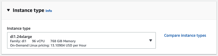 接着,我选择了 dl1.24xlarge 实例 (实际上这是唯一可选的实例)。