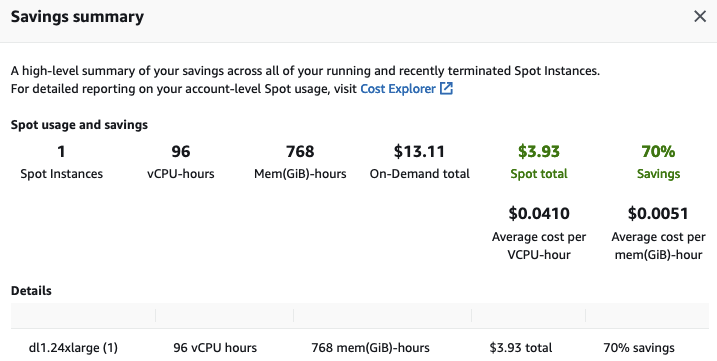 最后一步但也是相当重要的一步,用完后别忘了终止 EC2 实例以避免不必要的费用。查看 EC2 控制台中的 Saving Summary,我发现由于使用 Spot 实例,我节省了 70% 的成本,每小时支付的钱从原先的 13.11 美元降到了 3.93 美元。