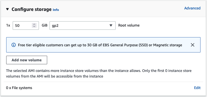 默认情况下,该 AMI 将启动一个具有 8GB Amazon EBS 存储的实例。但这对我来说可能不够,因此我将存储空间增加到 50GB。