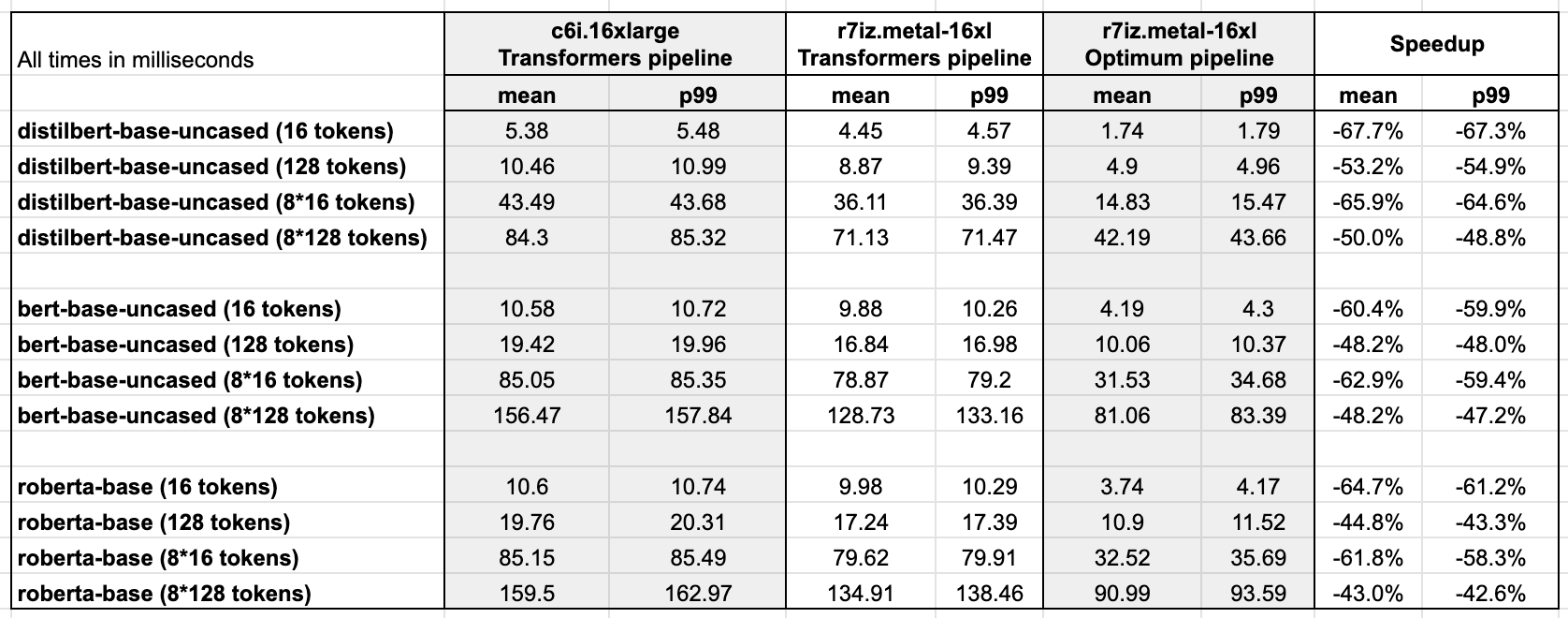 本文我们将重点关注推理。使用基于 PyTorch 的 Hugging Face transformers 模型,我们首先在 Ice Lake 服务器上分别测量它们在长、短两种文本序列上的性能。然后,我们在 Sapphire Rapids 服务器和最新版本的 Hugging Face Optimum Intel 上执行相同的测试,并比较两代 CPU 的性能。这里,Optimum Intel 是一个专用于英特尔平台的硬件加速开源库。