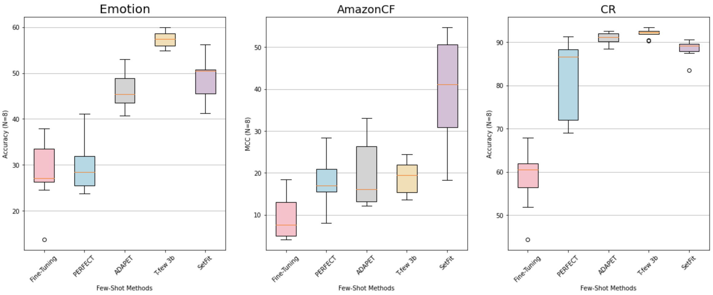在其他的数据集上,SeiFit 在各种各样的任务中也展示出了鲁棒的性能。如下图所示,每类仅需 8 个样本,其典型性能就超越了 PERFECT、ADAPET 以及微调后的原始 transformer 模型。SetFit 还取得了与 T-Few 3B 相当的结果,尽管它无需提示且模型小了 27 倍。